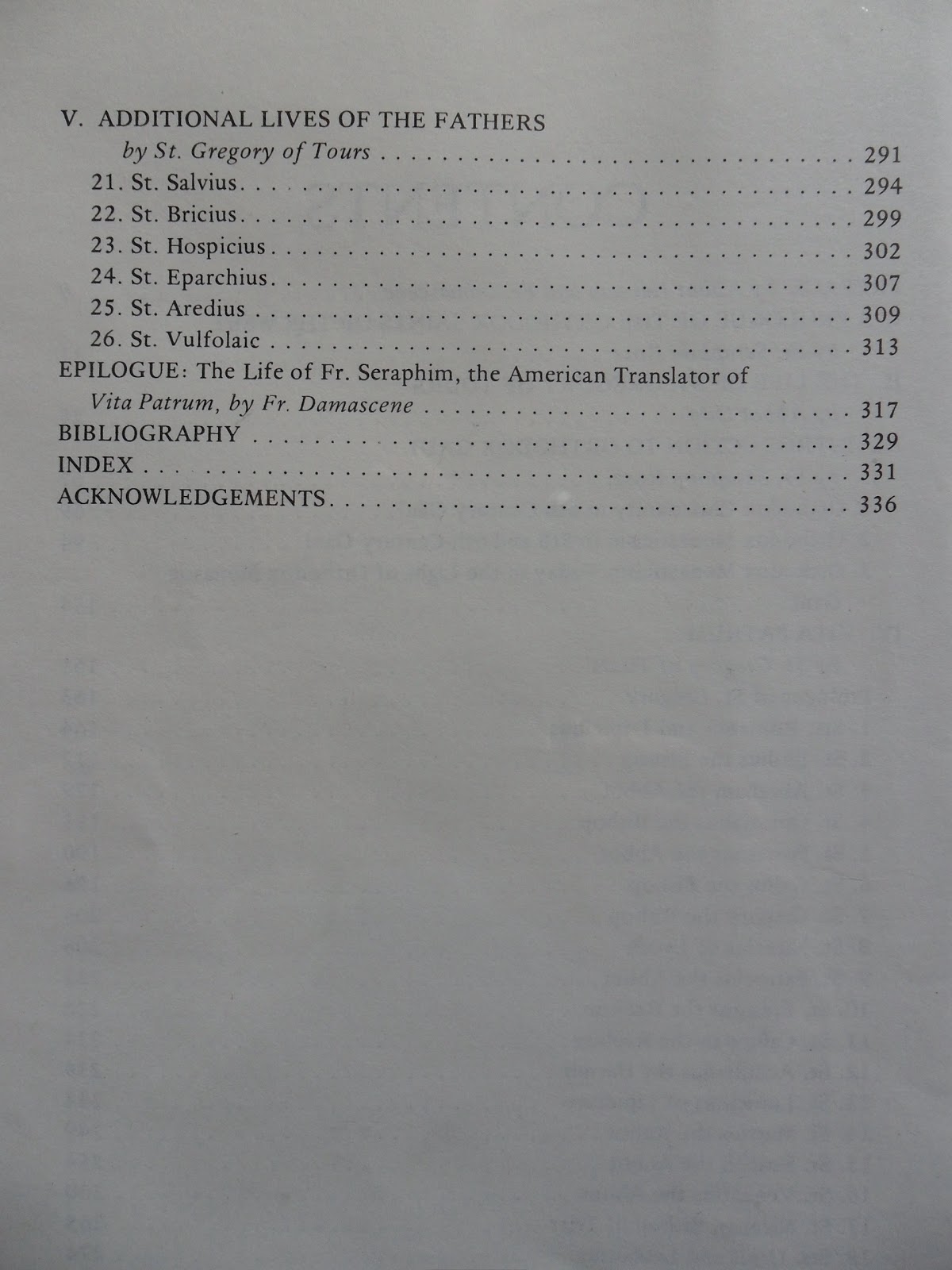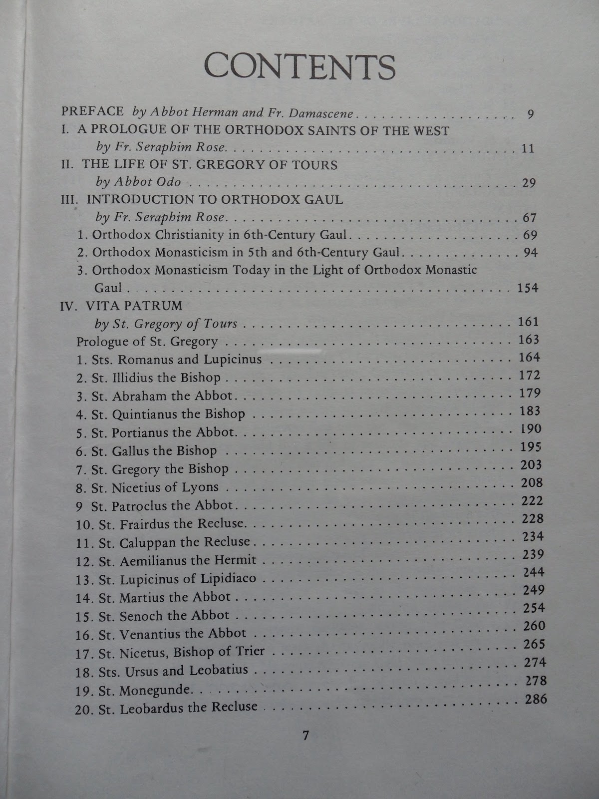 Archbishop John Maximovitch of blessed memory (St. John S&SF) gave as his testament to the Orthodox Christians of the West his love for the saints of Western lands. In fulfillment of this testament we now offer, as a separate book, the first English translation of the whole of the seventh of St. Gregory's Book of Miracles – THE LIFE OF THE FATHERS. No apology is necessary for presenting these twenty chapters on the monastic saints of Gaul in the 5th and 6th centuries. For the Orthodox Christian they are fascinating reading; the edifying homily that precedes each Life is most instructive for our spiritual struggle today; the spirit of the book is entirely Orthodox, and the Orthodox practices described in it have remained the inheritance of Orthodox Christians (but not of Roman Catholics) today, including the veneration of the "icons of saints" (the Latin text has iconicas instead of the more to be expected imagines) in chapter 12; and some of the incidents, just like the stories of the desert Fathers, have precise relevance for our problems today – for example, the story of the "charismatic" deacon who "healed in the name of Jesus" until St. Friardus exposed him as being in satanic deception (ch. 10).